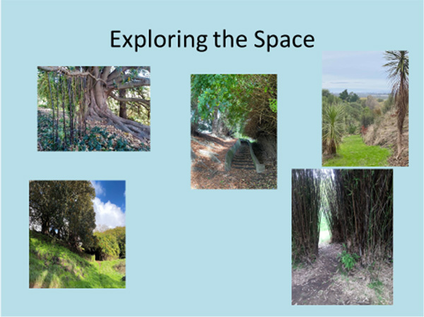 First stage—field work: Our hui (meeting), began with a karakia (blessing) and waiata (traditional te reo Māori song) to bring the group together in the space for the mahi (work) we were about to undertake. Armed with pens, clipboards and enthusiasm, participants and researchers set off from the ŌOLC open-air learning platform to explore the greater ŌOLC space (Figure 2). As facilitators for the group it required effort to manage our desire to actively participate. Our own teaching of student early childhood teachers and constant reflection on the possibilities offered by this new space meant researchers struggled to remain quiet as the teachers playfully explored the environment and recorded their responses.