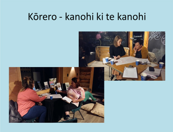 Second stage—conversations: We returned to the log cabin for refreshments and kōrero (conversations), where teacher participants shared their ideas and notes in response to questions used to frame the fieldwork and discussions. Figure 3 shows the process of kōrero, done in a relational way, kanohi ki te kanohi (face to face). This convivial intimacy the group shared, provided a fusion of researchers and participants that would not be the case in an ‘arms-length’ study done by professional but uninvolved moderators. In sociological terms this leveraged the ‘insider’ versus ‘outsider’ perspective to gather and interpret information (Blythe et al., 2013).