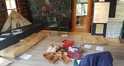 With much enthusiasm and a spring in my step, I purposely prepare the learning environment for every one of our nature-based sessions. Below are photographs I took of the log cabin used for introductory indoor engagement and the outdoor learning space.